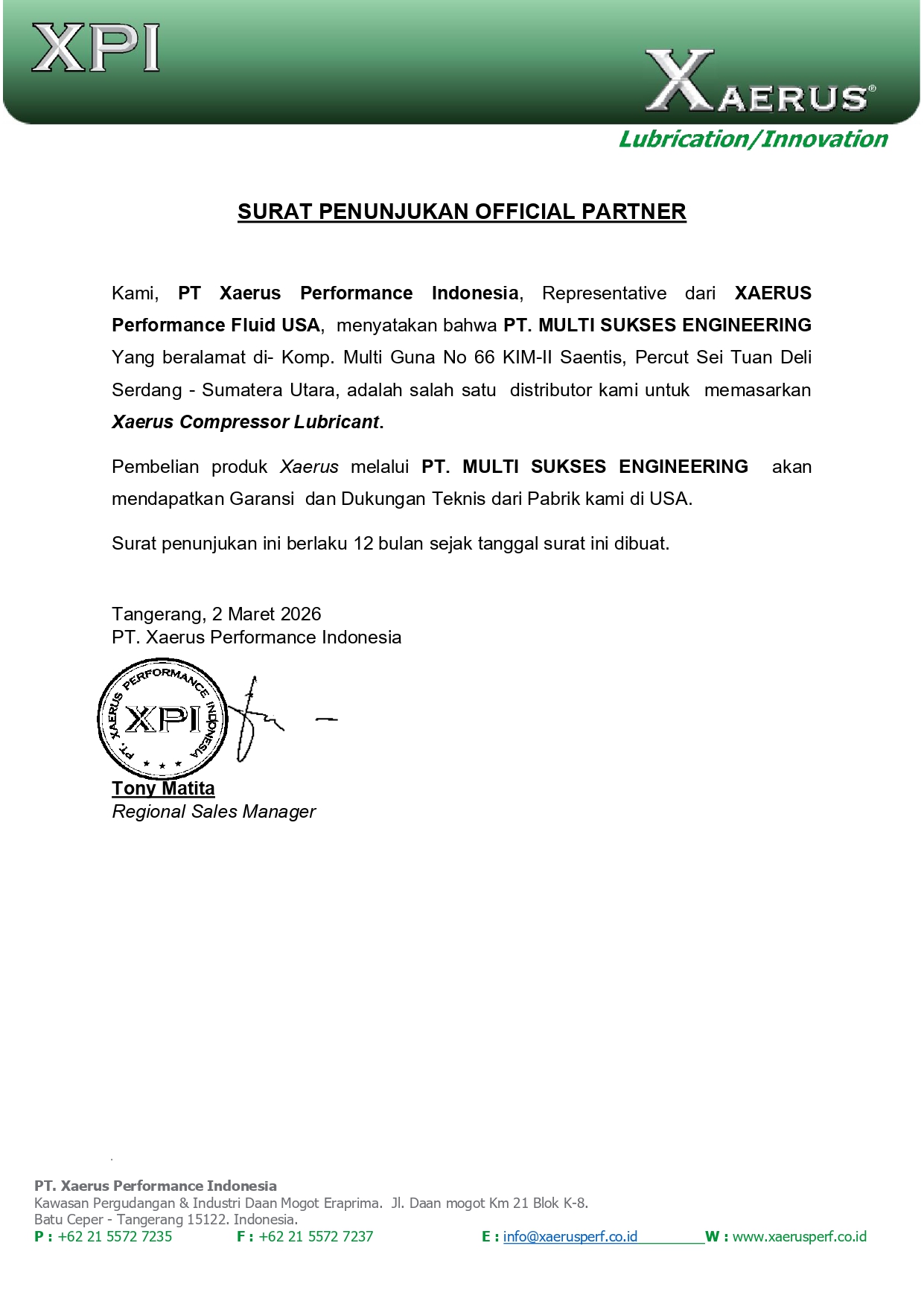 PT Multi Sukses Engineering merupakan distributor yang menyediakan produk pelumas Xaerus original dengan jaminan kualitas. Kami berkomitmen menghadirkan solusi pelumas industri yang terpercaya untuk mendukung performa mesin dan efisiensi operasional.